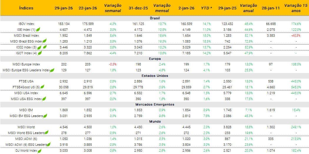 (2) O Índice S&P/B3 Brasil ESG mede a performance de títulos que cumprem critérios de sustentabilidade e é ponderado pelas pontuações ESG da S&P DJI. Ele exclui ações com base na sua participação em certas atividades comerciais, no seu desempenho em comparação com o Pacto Global da ONU e também cias sem pontuação ESG da S&P DJI.