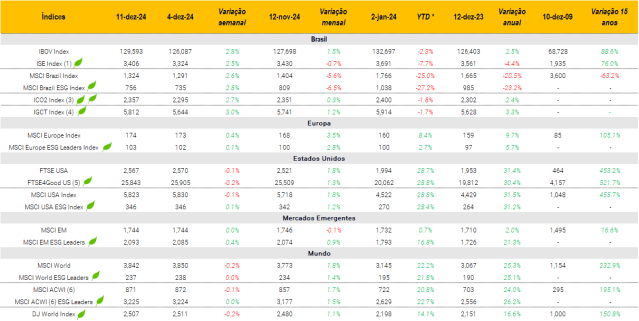 Quais tópicos abordamos ao longo do conteúdo? (i) Notícias no Brasil e no mundo acerca do tema ESG; (ii) Performance histórica dos principais índices ESG em diferentes países; (iii) Comparativo da performance do Ibovespa vs. ISE (Índice de Sustentabilidade Empresarial, da B3); e (iv) Lista com os últimos relatórios publicados pelo Research ESG da XP.