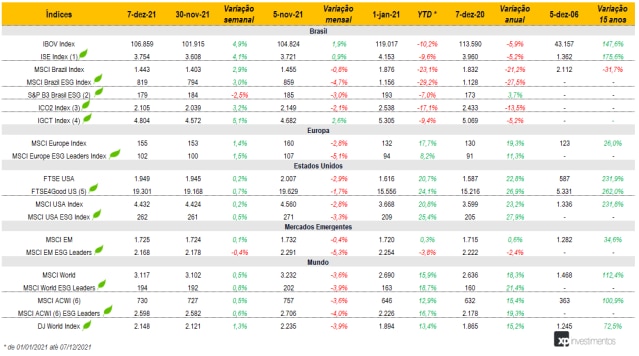 Quais tópicos abordamos ao longo do conteúdo? (i) Notícias no Brasil e no mundo acerca do tema ESG; (ii) Performance histórica dos principais índices ESG em diferentes países; (iii) Comparativo da performance do Ibovespa vs. ISE (Índice de Sustentabilidade Empresarial, da B3); e (iv) Lista com os últimos relatórios publicados pelo Research ESG da XP.
