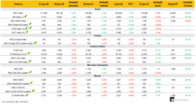 Quais tópicos abordamos ao longo do conteúdo? (i) Notícias no Brasil e no mundo acerca do tema ESG; (ii) Performance histórica dos principais índices ESG em diferentes países; (iii) Comparativo da performance do Ibovespa vs. ISE (Índice de Sustentabilidade Empresarial, da B3); e (iv) Lista com os últimos relatórios publicados pelo Research ESG da XP.