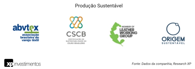 Indo além do couro, reconhecemos positivamente o compromisso da Arezzo com uma cadeia de suprimentos sustentável como um todo, conforme evidenciado por sua adesão a importantes certificações, apresentadas abaixo. Além disso, vale ressaltar que a empresa estabeleceu metas a serem alcançadas, com destaque para: (i) o compromisso de possuir o Selo de Origem Sustentável e a Certificação Brasileira de Sustentabilidade do Couro (CSCB) para todos os seus fornecedores; e (ii) a substituição de 30% dos materiais derivados do petróleo por componentes de fontes renováveis. Assim, vemos a Arezzo com fortes iniciativas de suprimento sustentável em relação a seus pares.
