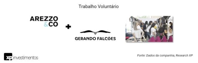 Trabalho voluntário: A empresa realiza diversas iniciativas, com destaque para: (i) Loja dos Sonhos – 150 voluntárias prepararam uma manhã especial para 100 mulheres atendidas pelas ONGs Vocação (SP) e Elas por Elas (RS); e (ii) Gerando Falcões – calçados doados pela Arezzo & Co. são transformados em auxílio financeiro para as dezenas de projetos da Gerando Falcões, entidade voltada para programas de geração de renda familiar, esporte e cultura para crianças e adolescentes das periferias e favelas da cidade de São Paulo.