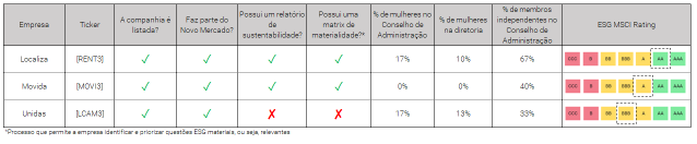 Em nossa visão, o setor brasileiro de locação de automóveis está avançando na direção certa para atender a essa demanda crescente e, portanto, vemos as empresas sob cobertura da XP (RENT3, MOVI3 e LCAM3) bem posicionadas para acompanhar essa tendência daqui para frente. Para este setor, vemos o pilar Governança como o mais importante dos três, seguido pelo pilar Social e Ambiental, respectivamente.