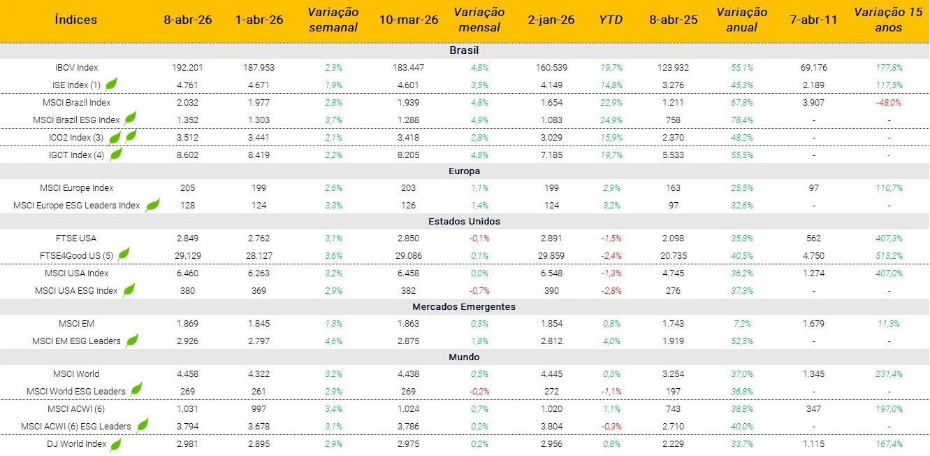 Quais tópicos abordamos ao longo do conteúdo? (i) Notícias no Brasil e no mundo acerca do tema ESG; (ii) Performance histórica dos principais índices ESG em diferentes países; (iii) Comparativo da performance do Ibovespa vs. ISE (Índice de Sustentabilidade Empresarial, da B3); e (iv) Lista com os últimos relatórios publicados pelo Research ESG da XP.