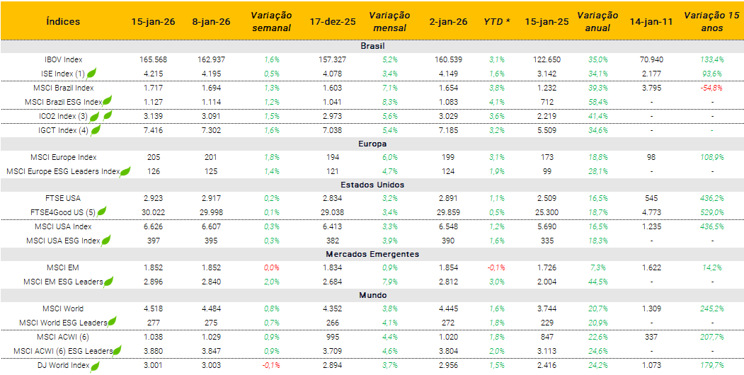 (2) O Índice S&P/B3 Brasil ESG mede a performance de títulos que cumprem critérios de sustentabilidade e é ponderado pelas pontuações ESG da S&P DJI. Ele exclui ações com base na sua participação em certas atividades comerciais, no seu desempenho em comparação com o Pacto Global da ONU e também cias sem pontuação ESG da S&P DJI.