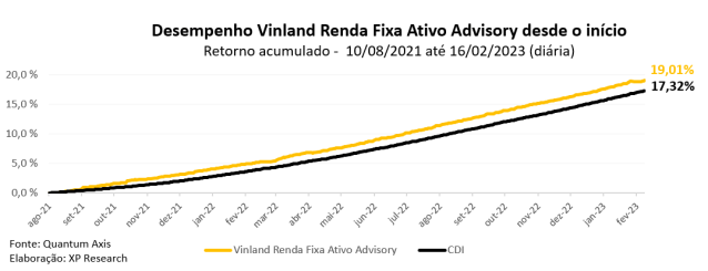 O Vinland Renda Fixa Ativo Advisory busca entregar CDI + 1% a.a. com consistência no longo prazo atuando como uma proxy do book de renda fixa do fundo Vinland Macro Advisory. Utiliza toda a estrutura de pesquisa macroeconômica e geração de ideias da casa tornando-se um produto com gestão ágil e flexível com posições que podem ser direcionais ou explorando ineficiências e distorções nas curvas de juros, sem histórico de quedas consideráveis. Em sua composição de carteira é possível encontrar investimentos em títulos públicos (local e internacional), inflação, juros globais e crédito privado, majoritariamente formado por ativos de emissão de bancos.