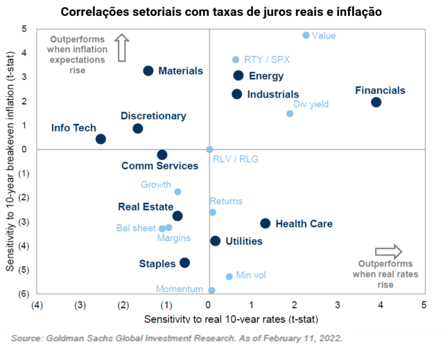 Perceba nas bolinhas azul claro que as características de growth ou crescimento ficam no quadrante inferior à esquerda, dos setores e empresas que se beneficiam mais de um cenário pouco inflacionário e com taxas de juros mais baixas. Já quando falamos de value ou valor, eles estão no quadrante superior à direita, dos setores e empresas que se beneficiam de um cenário com mais inflação e taxas de juros mais altas. O que explica muito da rotação que os gestores e investidores institucionais de forma geral estão fazendo, migrando suas posições em ações do 1º quadrante para o 3º quadrante, majoritariamente.