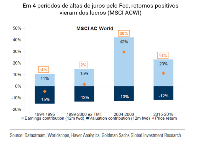 Taxas de juros nominais, mas principalmente as taxas de juros reais mais altas, podem ser um vento contrário para os mercados de ações, pois como já dissemos implicam em retornos mais baixos. Entretanto, historicamente, a taxa de fed funds em alta é acompanhada por retornos positivos das ações. O que muda é que os retornos, em geral, passam a ser cada vez mais impulsionados pelo crescimento de margem e receita, ou seja, dos lucros, uma vez que o valuation dessas empresas tendem a cair.