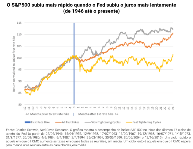 Nos 17 ciclos avaliados, quando o aperto do Fed foi mais lento — ou seja, não estava aumentando as taxas em todas as reuniões consecutivas de formulação de políticas do Comitê Federal de Mercado Aberto (FOMC) — o mercado de ações se saiu bem nos meses seguintes. Quando o ritmo era mais rápido — ou seja, as taxas eram elevadas em quase todas as reuniões do FOMC — as ações historicamente sofriam mais nos períodos seguintes. Em ambas as velocidades, no entanto, a volatilidade observada foi maior.