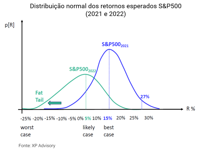 Olhando para 2022, é de se esperar que haja uma redução do retorno esperado das ações se comparado ao de 2021, além de um aumento do risco em geral que deve refletir em maior volatilidade. Se olharmos para o gráfico abaixo elaborado pelo time da XP Advisory, temos um retorno esperado para o S&P500 em 2022 muito mais concentrado próximo aos 5% a.a. do que os 15% esperados para o ano passado, que acabou se concretizando nos 27% de retorno. A medida que tenhamos ventos contrários ao longo de 2022, como por exemplo a necessidade de uma forte subida de juros, teríamos uma provável contração da economia dos EUA, o que poderia levar o S&P500 para próximo do “pior caso”, como destacado pelo gráfico, com retorno anual perto de -20% ou -25%.