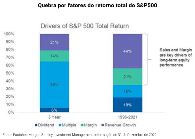 Além disso, ao longo dos últimos 3 anos o S&P 500 avançou quase 100% em dólar. Uma grande parte desse retorno (59%) veio da expansão de múltiplos das ações das empresas que compõem a sua carteira teórica. No longo prazo, os múltiplos podem até continuar se expandindo, mas entendemos que tanto para esse ano quanto no longo prazo, os principais catalisadores dos retornos superiores deverão vir do aumento das margens das empresas e crescimento das receitas.