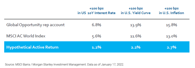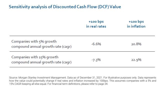 O próprio gestor do fundo, o Morgan Stanley, realizou uma análise de sensibilidade com algumas empresas que possuem um crescimento médio ponderado (CAGR) esperado de 5% e o mesmo estudo com empresas de CAGR de 15%, ou seja, mais alto crescimento. O impacto no valuation das empresas no modelo de fluxo de caixa descontado é negativo quase na mesma magnitude (-6,6% e -7,3%) para uma alta de 1,00% nas taxas de juros reais para ambos perfis de empresas. Porém essas mesmas empresas sofrem um impacto bastante positivo (+20,8% e 22,9%) no seu valuation para os mesmos 1,00% de acréscimo só que na inflação. Portanto, mexendo essas variáveis (taxa de juros real e inflação), o gestor tem a capacidade de avaliar quais as ações das empresas são mais ou menos impactadas, positiva e negativamente.