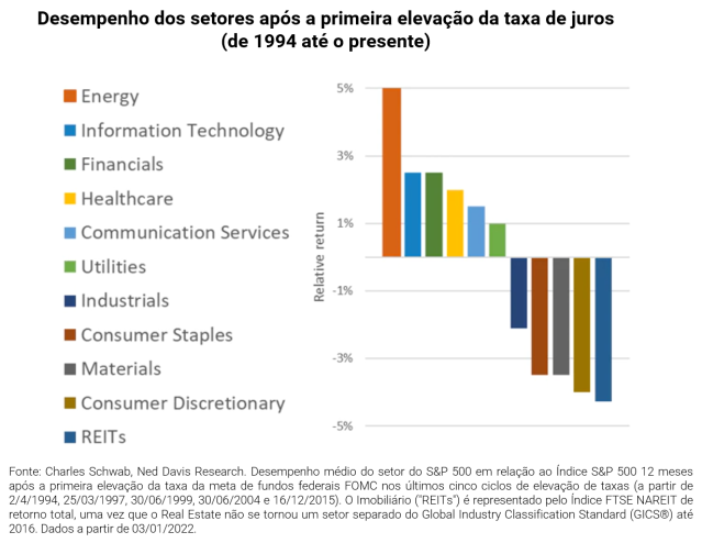 O gráfico abaixo reflete o desempenho médio de cada setor nos 12 meses após o aumento da taxa inicial nos últimos cinco ciclos de elevação de taxas.