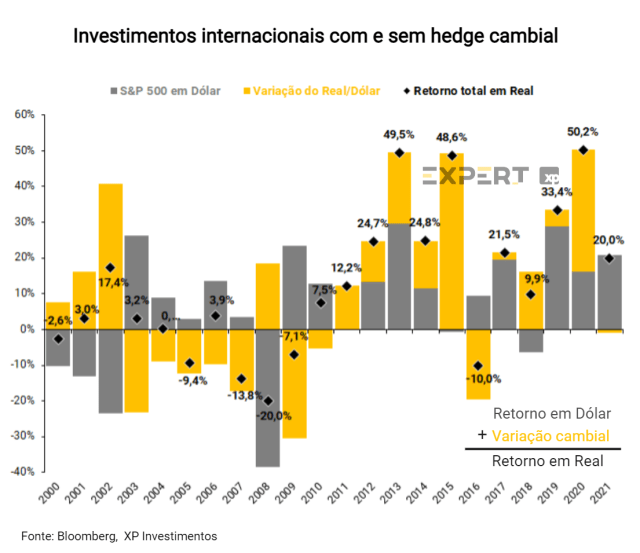 A titulo de informação e comparação, em setembro, nosso time de estratégia trouxe no gráfico da semana um comparativo histórico entre investimentos internacionais com e sem proteção cambial, mostrando que não há uma resposta certa sobre “qual o melhor”, dada a complexidade do assunto. Aqui temos uma linha histórica onde a barra cinza mostra o desempenho do índice S&P 500 dolarizado, e o ícone preto mostra o resultado da estratégia hedgeada. Compare os retornos a seguir.