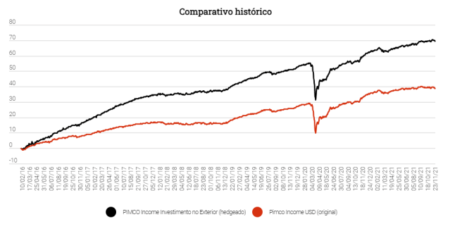 A título de comparação, simulamos abaixo o retorno do fundo PIMCO Income FIC FIM IE (linha preta), que se trata de um fundo aqui do Brasil que investe em um fundo de renda fixa internacional (linha vermelha), o fundo realiza a operação de hedge cambial, ou seja, o fundo original investe em papéis de renda fixa no exterior e o fundo do Brasil realiza a proteção contra as variações do dólar.