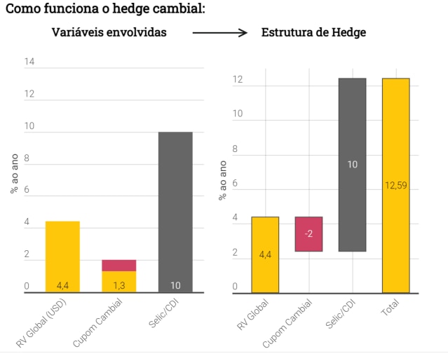 Abaixo fizemos um gráfico ilustrando esta situação, trazendo os três elementos citados anteriormente, nesse caso optamos pela renda variável global como o ativo dolarizado a ser analisado, vale pontuar, que esse modelo de estrutura de hedge é o mesmo para outras classes. Os valores do gráfico a seguir mostram retornos esperados com base nas nossas estimativas de retornos em um horizonte de 5 anos, por esse motivo as taxas divergem da praticada pelo mercado atualmente. Além da renda variável global temos a segunda barra que se refere ao cupom cambial, que é composto pelos juros dos Estados Unidos + prêmio de risco do Brasil. duas variáveis A nossa Selic/CDI subtraída do cupom cambial deverá ser somada ao retorno do investimento ou no caso do exemplo abaixo, do retorno esperado, tendo como resultado o retorno total do investimento com hedge.