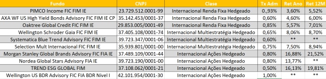 Entendemos que o processo de seleção de fundos possui certo nível de complexidade, e que a definição do tamanho da exposição, bem como a seleção de classes ativos, exige do investidor uma analise detalhada das alternativas e horizonte de investimento. Para auxiliar nessa jornada, estamos sempre trazendo soluções e alternativas para facilitar a tomada de decisão. Abaixo listamos 11 fundos de estratégias e composições variadas, porém com a mesma proteção: o hedge cambial.