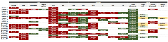 No mercado global, observamos o aumento nas posições vendidas em bolsa americana que tem sido um dos maiores promotores de performance dos fundos multimercados da classe Macro após a realização recente dos mercados globais. Apesar do aumento marginal, o número de gestores com posições em bolsas globais caiu se comparado aos meses anteriores.