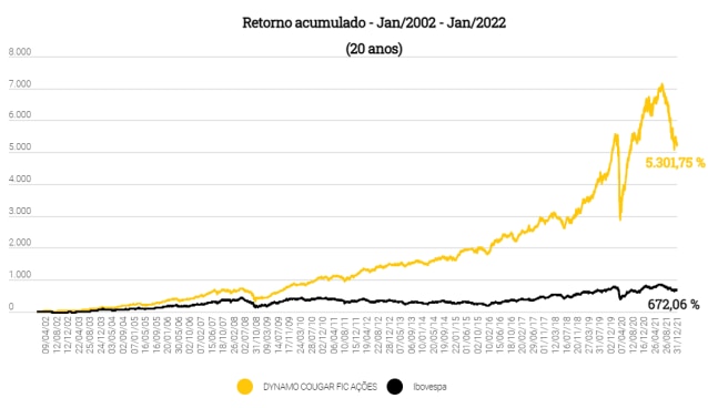 Com um longo histórico de existência, o Dynamo Cougar é um fundo de ações que foi criado em setembro de 1993. Nesses quase 30 anos de existência, até o fechamento do ano de 2021, o fundo rendeu 3.815.282% contra 102.056% do Ibovespa no mesmo período – um retorno anualizado de 45,08% contra 27,69% do Ibovespa.