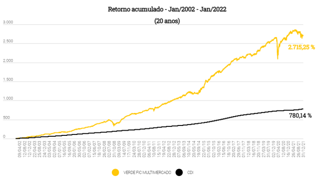 Gráfico de rentabilidade do fundo Verde AM Advisory X60 em comparação com o CDI nos últimos 20 anos