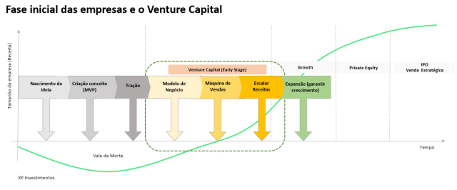 Aqui vale um ponto de destaque importante, recentemente abordamos com maiores detalhes os investimentos em Private Equity (“PE”), para falar sobre o foco dos gestores de PE que é investir em empresas com grande potencial de crescimento. Dentro do ciclo de vida de uma empresa, existem diversos pontos de entrada e oportunidades, dessa forma, o que diferencia o PE do VC é o ponto de entrada, sendo reservado ao VC a fase inicial das empresas.