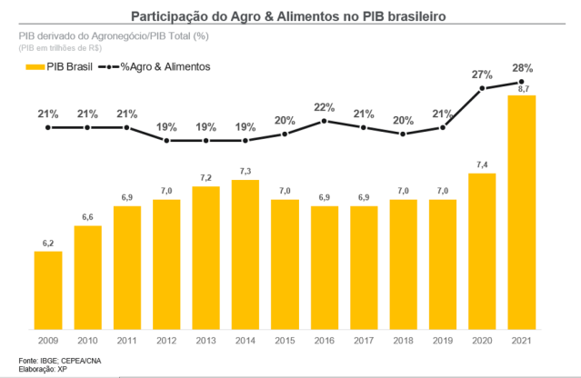 Dados relacionados ao PIB do agronegócio brasileiro, calculados pelo Cepea (Centro de Estudos Avançados em Economia Aplicada), Esalq/USP e a CNA (Confederação da Agricultura e Pecuária do Brasil), mostram um crescimento considerável de representatividade do segmento na economia brasileira. Chegando a 27,6% de representatividade no PIB brasileiro no ano de 2021, a metodologia do Cepea/CNA se difere dos números divulgados pelo IBGE por englobar além da produção de insumos, todas as demais atividades que estejam relacionadas ao agronegócio, como a agropecuária, indústria e serviços.