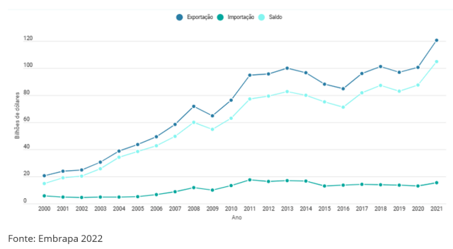 Em seu estudo a Embrapa também mostram que ao longo dos anos, o agro foi aumentando sua representatividade nas contas externas do Brasil, saindo dos USD 21 bilhões em 2000 para USD 121 bilhões de dólares nos anos recorrentes, um aumento de 485,7%.