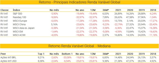 Com o objetivo de mantê-lo informado sobre o desempenho da indústria de fundos, mensalmente, publicaremos um resumo da performance das diferentes classes de ativos locais e globais. Além de mostrarmos os principais índices que mais impactam determinados tipos de fundos, também sinalizamos dentro do nosso próprio peer, ou conjunto de fundos, qual a rentabilidade do fundo com a melhor performance (Top 1), qual teve a pior performance (Bottom 1), a mediana dos retornos dos fundos do grupo no mês, no ano, em 12 meses e em 36 meses anualizada e não acumulada, além dos retornos nos anos anteriores de 2021, 2020, 2019 e 2018.