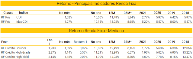 Com o objetivo de mantê-lo informado sobre o desempenho da indústria de fundos, mensalmente, publicaremos um resumo da performance das diferentes classes de ativos locais e globais. Além de mostrarmos os principais índices que mais impactam determinados tipos de fundos, também sinalizamos dentro do nosso próprio peer, ou conjunto de fundos, qual a rentabilidade do fundo com a melhor performance (Top 1), qual teve a pior performance (Bottom 1), a mediana dos retornos dos fundos do grupo no mês, no ano, em 12 meses e em 36 meses anualizada e não acumulada, além dos retornos nos anos anteriores de 2021, 2020, 2019 e 2018.