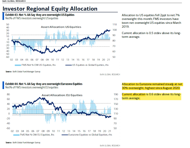 Figura 44: % líquida – Alocação de Ativos Digamos que eles tenham overweight em ações da Zona do Euro. A alocação à Zona do Euro permaneceu estável em 30% acima da overweight líquida, a maior desde agosto de 2000. A alocação atual está acima de sua média de longo prazo.
