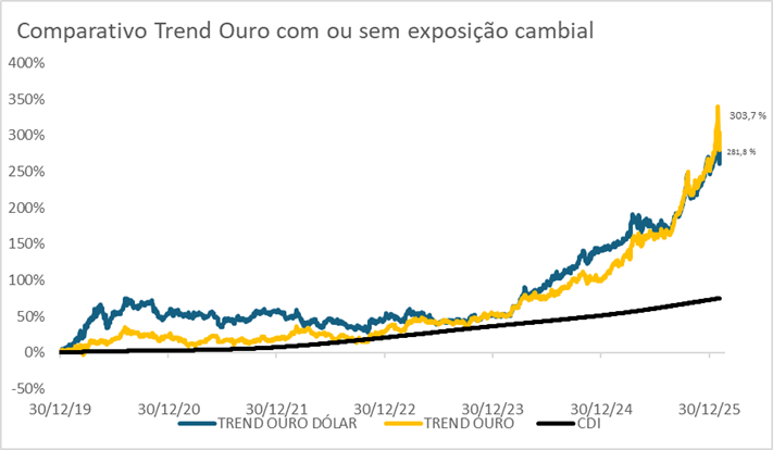 Em simulações recentes, o Trend Ouro Dólar apresentou uma valorização acumulada de 281%, enquanto o Trend Ouro hedgeado acumulou 303%. Apesar de ambos capturarem o movimento estrutural do ouro, a versão sem exposição cambial mostrou maior consistência ao longo do tempo, com menor volatilidade.