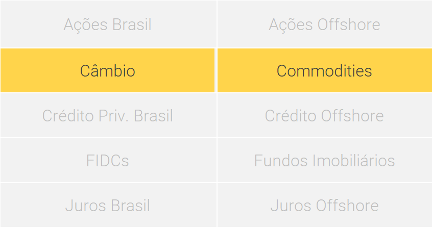 • O investimento em Mercados Futuros embute riscos de perdas patrimoniais significativos. Commodity é um objeto ou determinante de preço de um contrato futuro ou outro instrumento derivativo, podendo consubstanciar um índice, uma taxa, um valor mobiliário ou produto físico. É um investimento de risco muito alto, que contempla a possibilidade de oscilação de preço devido à utilização de alavancagem financeira. A duração recomendada para o investimento é de curto prazo e o patrimônio do cliente não está garantido neste tipo de produto. As condições de mercado, mudanças climáticas e o cenário macroeconômico podem afetar o desempenho do investimento.
