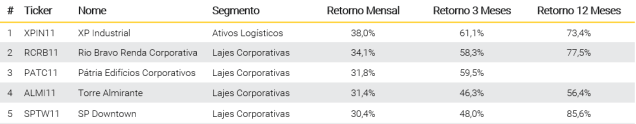 Essa robusta valorização foi distribuída em todos os três fundos recomendados – Rio Bravo Renda Corporativa (RCRB11), Pátria Edifícios Corporativos (PATC11) e The One (ONEF11), com altas de 34,1%, 31,8%, 6,0%, respectivamente.