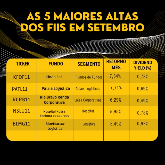 A maior alta do mês de setembro foi a do Fundo de Fundos KFOF11, com ganho de 7,84%. De acordo com seu Relatório Gerencial de agosto, o fundo tem maior concentração em FIIs de Recebíveis (26%, com destaque para KNCR11 e CPTS11), FIIs de Lajes Corporativas (25%, com destaque para BRCR11 e PVBI11) e FIIs de Shoppings/Varejo (22%, com destaque para HSML11 e MALL11). O fundo teve forte elevação de 8,89% em seu valor patrimonial com o resultado de seu portfólio em agosto, que foi ainda maior que o desempenho do IFIX. No mesmo documento, o fundo afirma ainda que o deságio médio dos fundos de sua carteira à época era de 8,8%, o que, aliado ao deságio de 13,3% sobre o valor patrimonial do próprio fundo ao final de agosto, criaria um upside potencial, na visão da gestora, de 26,5% no valor de mercado do fundo. No último dia do mês, o fundo anunciou o pagamento de proventos no valor de R$ 0,72/cota, 2 centavos acima do valor pago nos três meses anteriores.