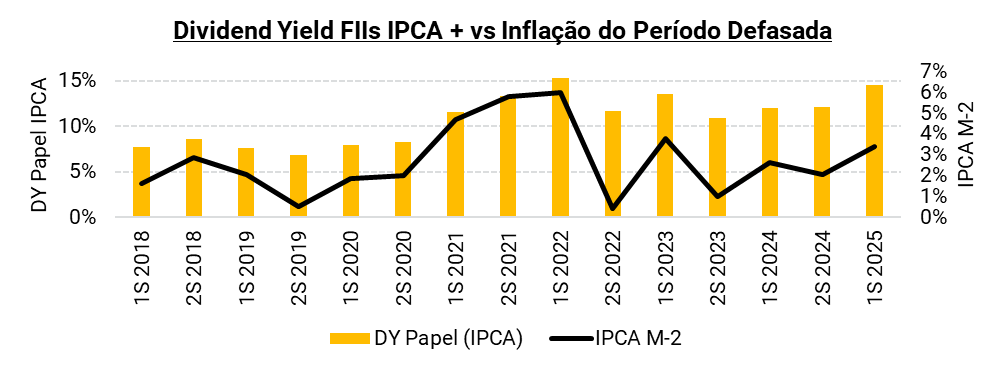 Em nossa visão, o cenário descrito continua favorável para os FIIs de papel indexados ao IPCA, o que nos leva a manter uma perspectiva positiva para esses fundos — especialmente aqueles com perfil de risco baixo a moderado e carteiras bem diversificadas.