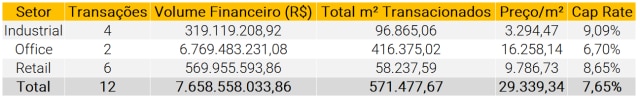 O volume financeiro total foi de R$ 569.955.593,86. Dessa maneira, o cap rate médio de retail foi de 8,65% a.a. A principal transação de impacto no cap rate, foi do Shopping Uberaba, com valor de 8,75% a.a. O empreendimento foi adquirido pelo fundo a HSI Malls – Fundo de Investimento Imobiliário, que passou a deter 100% do ativo.