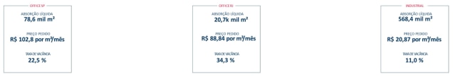 No mercado de Office, o destaque vai para a venda de parte dos ativos do portfólio da BR Properties para a Brookfield. Os ativos incluídos na operação são: Panamérica Park, TNU, Panamérica Green Park I, Complexo JK – Bloco B, Complexo Centenário Plaza, Parque da Cidade – Torres Paineira, Aroeira e Jatobá, Alphaville, Glória, Ed. Manchete, Ed. Ventura – Torre Oeste, Ed. Ventura – Torre Leste, Brasília, e os terrenos Panamérica Green Park II e Panamérica Green Park III. A área total transacionada foi de 394.730 m², pelo valor de R$ 5.921.647.797,68.
