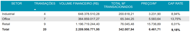 Com relação ao mesmo período do ano anterior, em que foram registradas 39 transações, o volume financeiro foi duas vezes menor. Em relação ao cap rate médio das operações de escritórios, industrial e varejo, verificou-se um crescimento de 1,53 p.p frente ao trimestre anterior, alcançando 9,18% a.a.