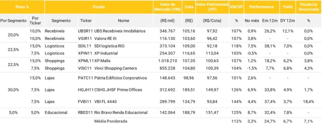 Assim como na carteira anterior, “Recebíveis” e “Outros” também tiveram uma contribuição relevante para a nossa carteira. Todos os fundos que compõem esses nichos apresentaram bons resultados, oferecendo bons retornos aos cotistas que entraram. O segmento “Outros” foi composto pelo Rio Bravo Renda Educacional (RBED11), fundo de gestão ativa que tem como objetivo a geração de renda através de universidades. Já “Recebíveis” é constituído pelo UBS Recebíveis – UBSR11 (+2,16%) e pelo Valora RE III – VGIR11 (+3,57%).
