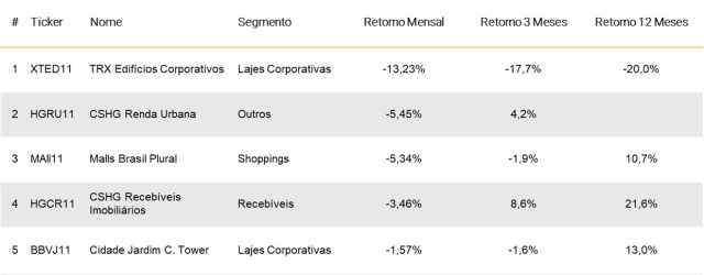 Já as performances negativas, destaca-se, mais uma vez, o TRX Edifícios Corporativos (XTED11) com -13,23%. O fundo teve problemas graves em sua concepção – e os carrega ainda hoje. Composto por um ativo, o Atlântico Office em Macaé no Rio de Janeiro, empreendimento com localização questionável e uma alta concentração de inquilino. Com o tempo, saíram os locatários, levando a uma vacância crônica e nenhum rendimento distribuído a seus cotistas há mais de 18 meses.