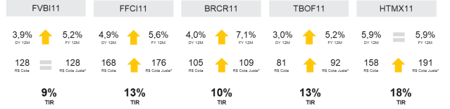 BUY – Rio Bravo Renda Corporativa (FFCI11): Fundo de lajes corporativas da Rio Bravo. A gestora assinou uma proposta vinculante para aquisição de um ativo imobiliário em São Paulo, o que deve gerar um upside interessante no capital do fundo. Ademais, ocorrerá o término da carência de boa parte dos contratos, levando a aumentos importantes de dividendos