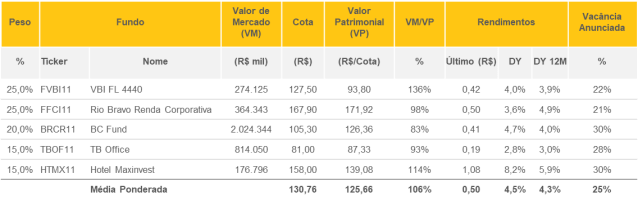 • Parte dos fundos que compõem a Carteira Renda obteve aumento expressivo na cota, superando o seu valor intrínseco. Tal precificação tem pressionado o Dividend Yield, acarretando diminuição no prêmio de risco para os novos entrantes. Diante disso, buscamos oportunidades mais interessantes e resolvemos remover os seguintes fundos da carteira, por ora: • HOLD – CSHG JHSF Prime Offices (HGJH11)