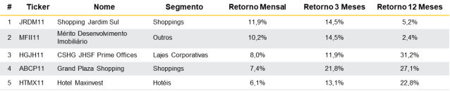 Analisando as melhores performances, o Shopping Jardim Sul (+11,9%) exibiu o maior retorno do mês. Recentemente, o fundo captou novos recursos através da Segunda emissão, totalizando R$ 19,5 milhões. Em seguida, segue o Mérito Desenvolvimento Imobiliário com +10,2%. Por fim, encontra-se o CSHG JHSF Prime Offices com +8,0%.