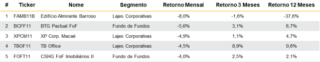 Das maiores quedas, encontra-se o Edifício Almirante Barroso (-8,0%), fundo que tem enfrentado grandes desafios, já que a sua única locatária anunciou que irá sair do empreendimento. Em seguida, se encontra o BTG Pactual FoF (-5,6%), que realizou a sua Sétima Emissão e tem visto um alto giro de suas cotas no curto prazo. Por último, tem-se o XP Corp. Macaé (-4,9%) que tem sofrido alta volatilidade à medida em que o prazo para uma nova revisional se aproxima (Jun/19).