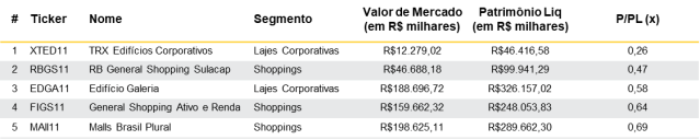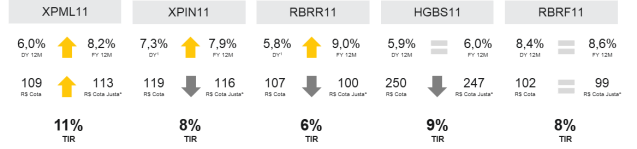 • BUY – XP Malls (XPML11): Fundo de Shopping Center que tem expandido seu portfólio conforme prospecto. Com a captação de novos recursos na 3ª Emissão, o fundo tem a possibilidade de melhorar e expandir o seu portfólio, levando a incrementos importantes de dividendos e de valor de cota.