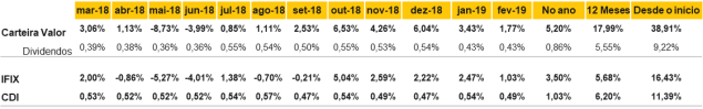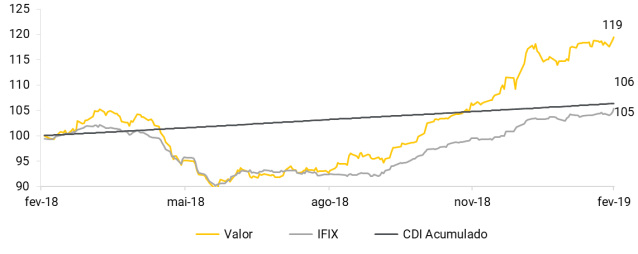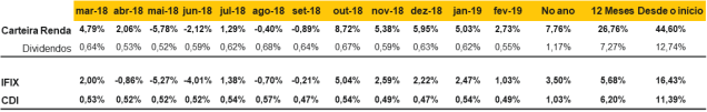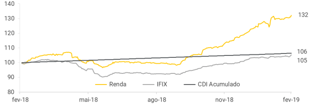 Acompanhando os bons ventos do mercado, a nossa Carteira Recomendada Renda apresentou a quinta alta consecutiva no mês de fevereiro de 2019, alcançando 2,73%. A carteira segue performando acima do benchmark do mercado (IFIX), atingindo uma diferença de 170 bps. O CSHG JHSF Prime Offices (+7,99%) e o Hedge Brasil Shopping (+5,43%) foram os destaques do mês. O CSHG JHSF Prime Offices (HGJH11) possui ativos muito bem localizados e, por isso mesmo, muito disputados por inquilinos da região. Vemos aumentos de locação sensíveis até o final do ano que vem, levando a incrementos importantes de dividendos e de valor de cota. O Hedge Brasil Shopping (HGBS11), maior fundo de shoppings do Brasil, tem entregue bons dividendos e ganhos de capital aos seus cotistas. Recentemente, encerrou a sua sétima emissão de cotas, perfazendo o montante de aproximadamente R$ 300 milhões.
