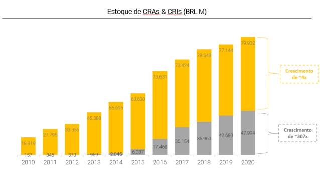 Dinâmica favorável dessa classe de ativos: o produto ganhou espaço nos últimos anos entre as pessoas físicas no Brasil por conta de sua isenção de impostos e popularidade do setor. De 2010 a 2020 o estoque de CRA saiu de BRL 157Mi para BRL ~48Bi. (crescimento de 307x)