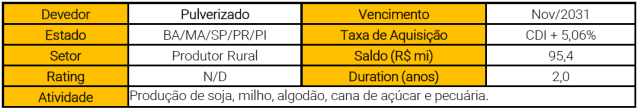 Em termos de diversificação regional, os CRAs no portfólio do fundo estão associados a empresas com operações em 8 estados brasileiros, com destaque para Bahia (28% da área produtiva), Maranhão (27%) e Goiás (20%). Já em termos setoriais, o portfólio de CRAs do fundo está integralmente associado a produtores rurais, predominantemente envolvidos com a produção de soja. O maior devedor da carteira de CRAs (KPS Agropecuária) representa 36,5% do saldo total, e acreditamos que o fundo deve melhorar a diversificação do portfólio à medida em que aloca os recursos da 2ª emissão de cotas.