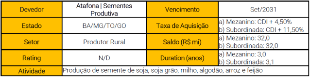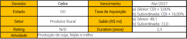 Portanto, esperamos que o fundo entregue uma boa rentabilidade no curto prazo, dada a projeção de manutenção da taxa CDI em patamares altos e o spread médio de sua carteira, que é o maior dentre os FIAgros de nossa cobertura. Além disso, avaliamos que o fundo tem a oportunidade de melhorar sua diversificação setorial com a alocação dos recursos de sua segunda emissão de cotas, ainda que ao custo de alguma redução na taxa média de seu portfólio. Desse modo, iniciamos nossa cobertura do fundo com recomendação de COMPRA.