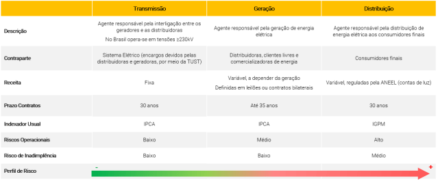 No Brasil, o setor elétrico está dividido em 3 segmentos: geração, transmissão e distribuição. De maneira simplista, as geradoras produzem energia, as transmissoras a transportam do ponto de geração até os centros consumidores, de onde as distribuidoras a levam até a casa dos consumidores cativos. Há ainda as comercializadoras, as quais são autorizadas a comprar e vender energia para os consumidores livres.